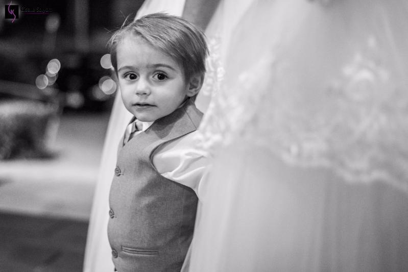 Menino de 3 anos muito feliz se pendura nas mãos das damas maiores, sorrindo enquanto espera para entrar no casamento em Igreja Santo Agostinho em Curitiba - PR