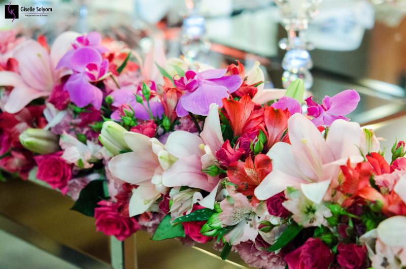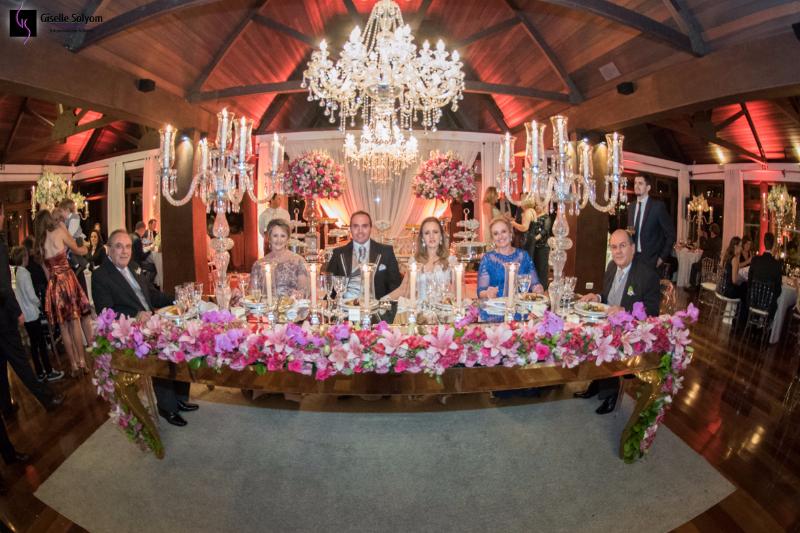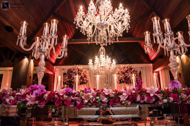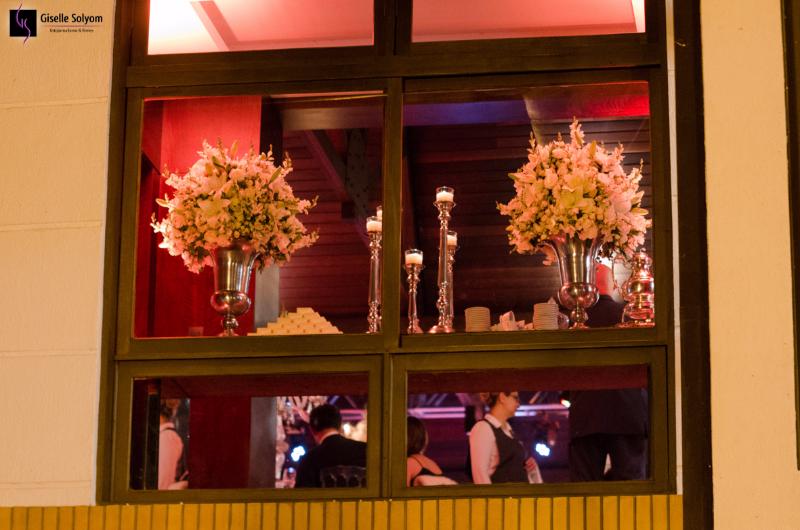 Grinalda e buquê sofisticados sobre a mesa no Hotel Bourbon em Curitiba